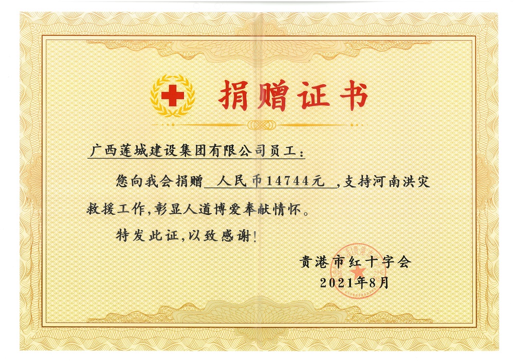 2021年向贵港市红十字会河南洪灾捐款,员工捐款14744元