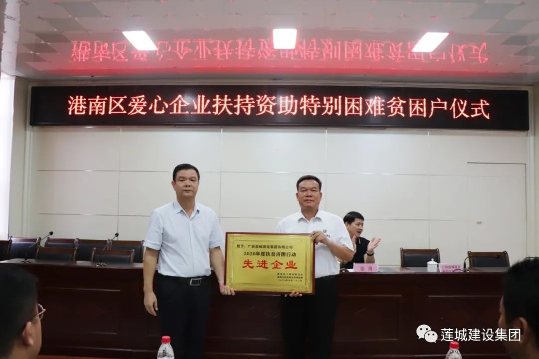 仪式的最后,公司总经理助理姚寿明代表公司为30户特别困难户按照2000元/户的标准发放了资助金,总额达6万元。陈副主任代表港南区政府授予公司“2020年度扶贫济困行动先进企业”牌匾。